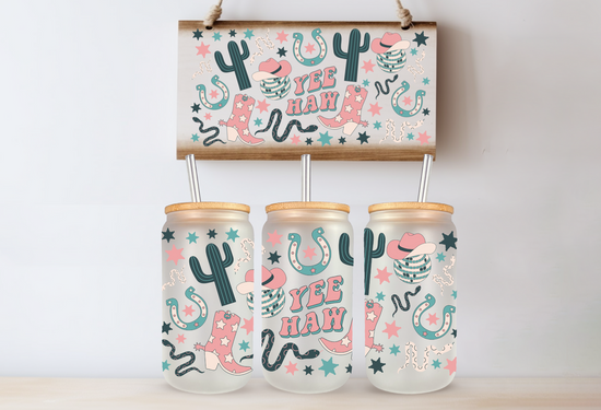 Yee Haw Pastel Cowgirl UV 16oz. Libby Glass DTF Wrap